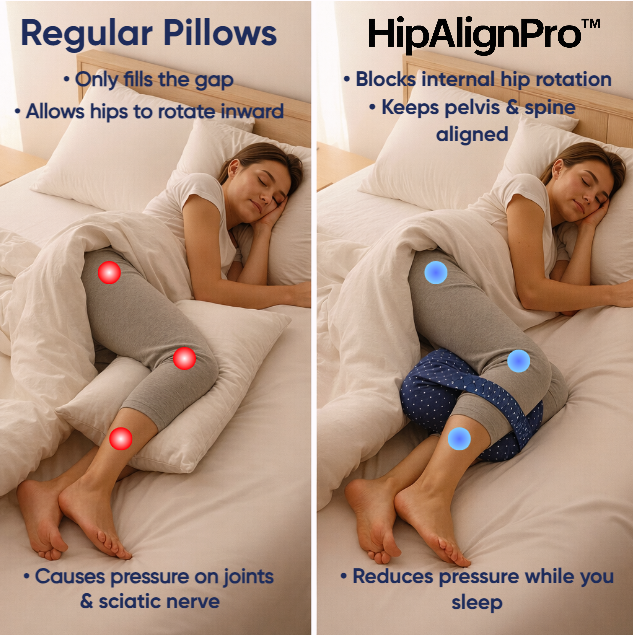 HipAlignPro™ is engineered to block internal hip rotation while you sleep — helping keep your hips and spine aligned and reduce sciatic pressure naturally